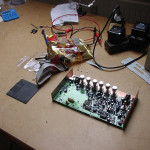 A bigger problem was the case. For some reason I did not opt in for the case from acidcode-member Wintermute but instead wanted to do my own case. This was harder than expected: The wood-case I was imagining was not possible with my crude tools. So I referred to the plan of a friend of mine, who used pre-etched PCBs for cases. The can be cut very exactly and to connect them you just solder them together.