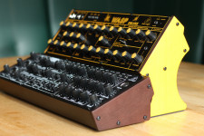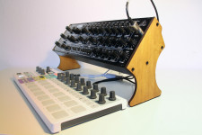 The panels are cut from birch plywood. I stain them with a water-based stain and treat them with an oil-wax-mixture. They are 5mm thick and 19mm in height. On the bottom are inserts of foam rubber, which prevent the synthesizer to slide away while being used. All manufacturing is done in germany.